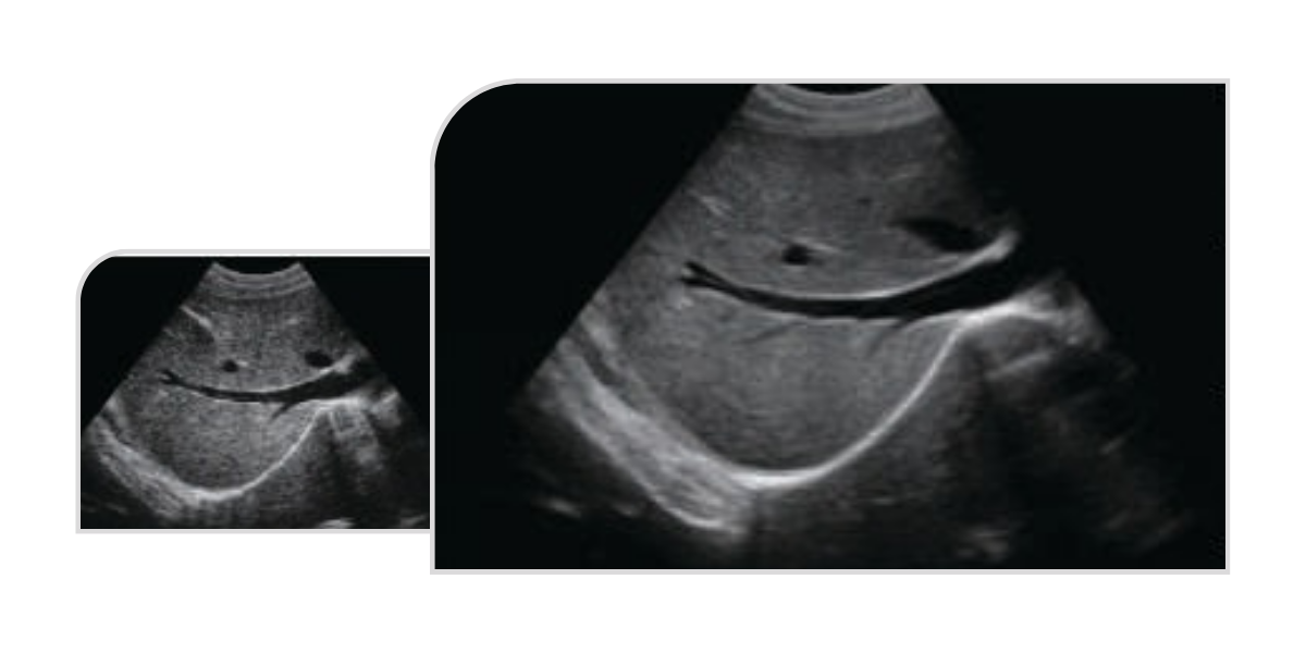 THI enhances image clarity by improving tissue contrast resolution, spatial resolution, and by eliminating near-field artefacts. It is especially useful in the diagnosis of cardiovascular and abdominal conditions, providing clearer visualisation of lesions and more accurate delineation of boundaries - particularly in patients who present imaging challenges.